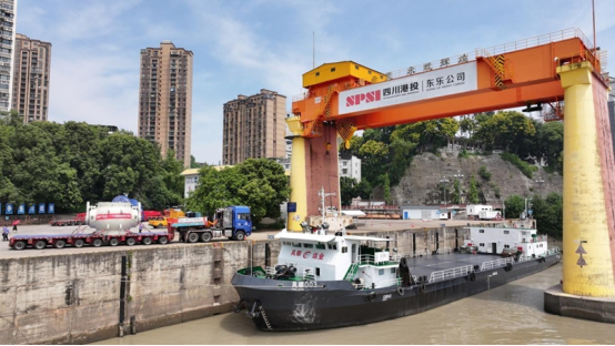 乐山大件码头作为四川大件运输水陆转换枢纽,地处三江汇流下游,航道水深稳定、江面宽阔,具备千吨级通航条件。自1995年为服务三峡枢纽工程兴建以来,已成为长江经济带重要物流节点。利用码头配备的550吨桥式起重机,球阀与中压模块将在这里完成吊装转运的全过程。“采用桥式起重机,是因为码头固定轨道作业稳定,能最大程度保障设备安全。”东方大件物流技术部技术经理罗崎瑞介绍说,“单件设备上船后需要花1小时进行加固作业,确保航行中万无一失。”