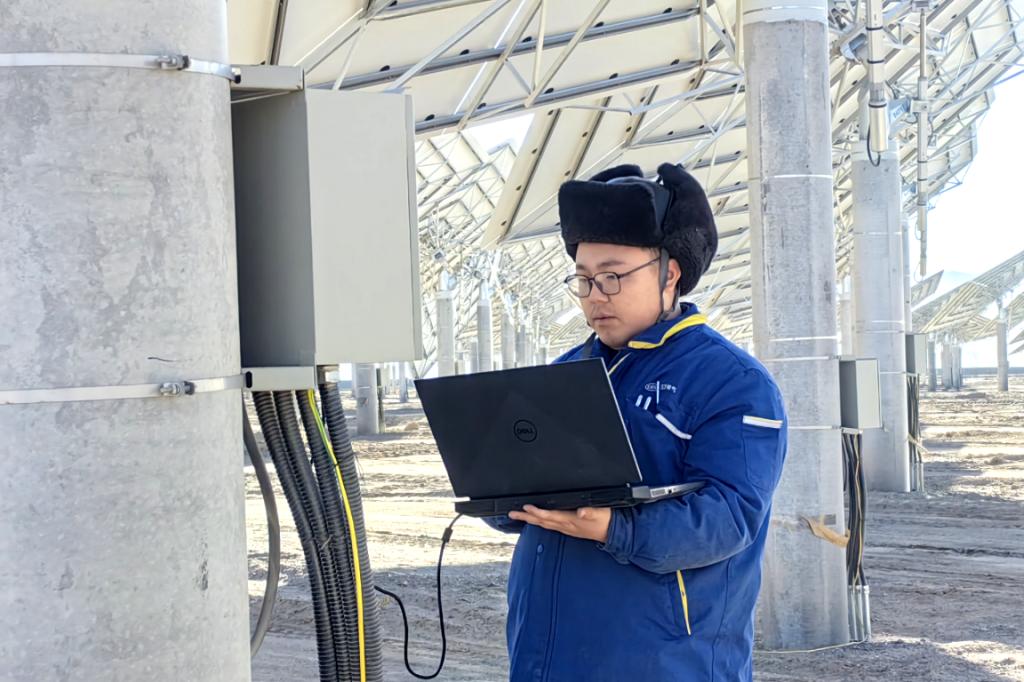 在甘肃阿克塞汇东新能“光热+光伏”项目现场,零下10度的环境下,东方锅炉项目团队成员林雪松在进行定日镜清洁度抽查工作,以确保定日镜聚光反射太阳能的精确性能;东方自控王强开展镜场LOC箱设备调试工作,为聚光集热做准备。