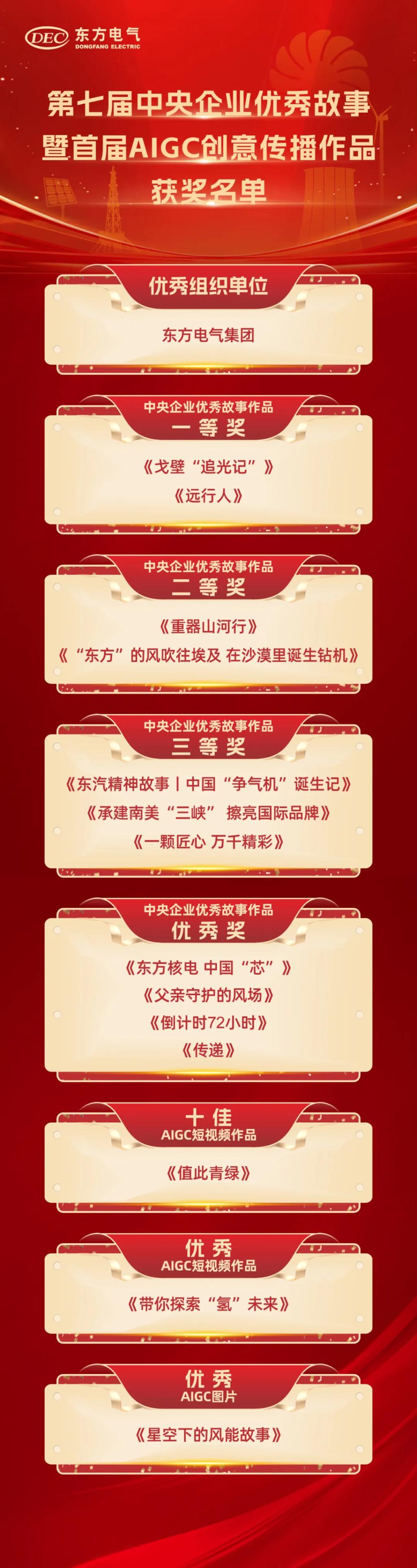 其中,《戈壁“追光记”》《远行人》荣获中央企业优秀故事作品一等奖,《重器山河行》《“东方”的风吹往埃及 在沙漠里诞生钻机》荣获中央企业优秀故事作品二等奖,《东汽精神故事丨中国“争气机”诞生记》《承建南美“三峡”擦亮国际品牌》《一颗匠心 万千精彩》荣获中央企业优秀故事作品三等奖,《东方核电 中国“芯”》《父亲守护的风场》《倒计时72小时》《传递》荣获中央企业优秀故事作品优秀奖,《值此青绿》获评十佳AIGC短视频作品,《带你探索“氢”未来》获评优秀AIGC短视频作品,《星空下的风能故事》获评优秀AIGC图片。